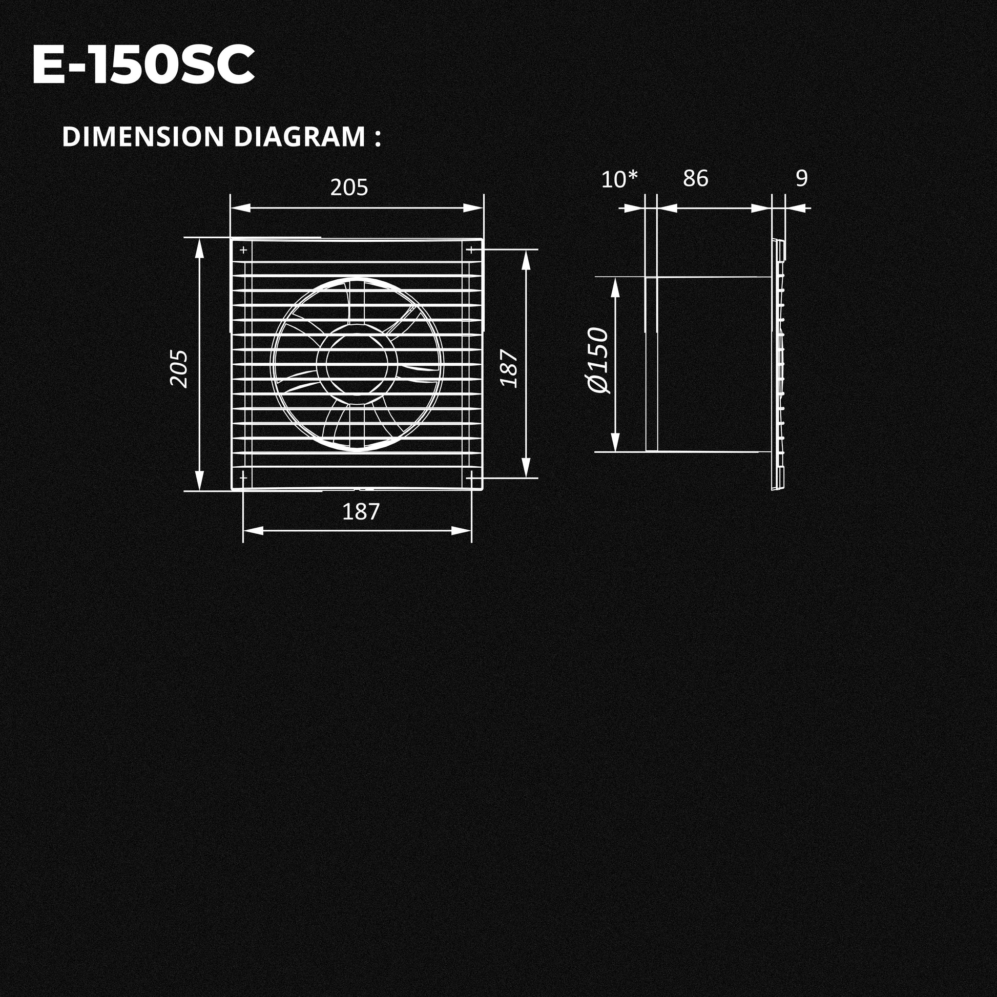 - Diameter:150mm , Max. airflow: 250m3/h , Max. air pressure: 54Pa , Noise Level:38(dB) , Power: 16w